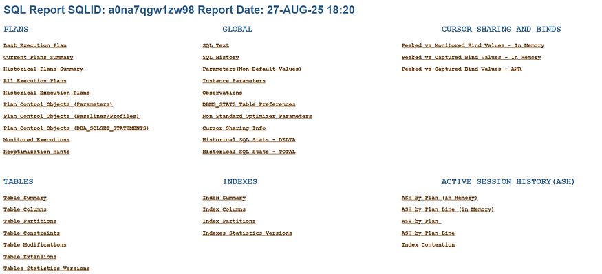 Before Oracle Database 23ai, the awrsqrpt.sql script was commonly used to analyze the evolution of a SQL statement’s execution plan, plan statistics, CPU usage, I/O, and elapsed time over a specified period. However, this approach had two main limitations: